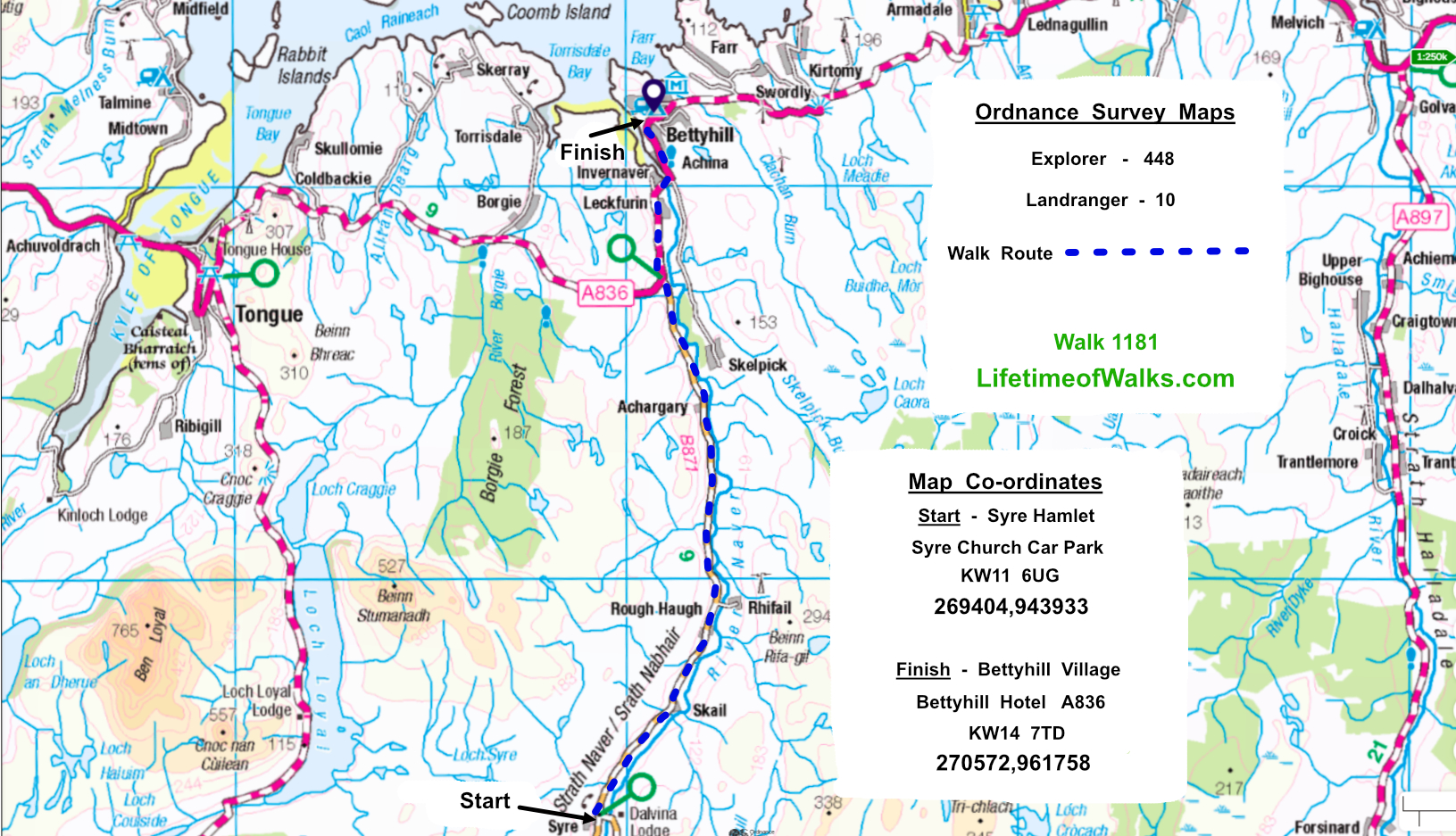 Start: at KW11 6UG - Syre Church B873/B871 Finish: at KW14 7TD - Bettyhill Hotel, North Coast, Highlands Click Here for Previous Walk on the Fill-In Walk - Walk 1180 Click Here for Next Walk on the Fill-In Walk - Walk 1182 Click Here to Return to 'Lifetime of Walks' Homepage | |||||||