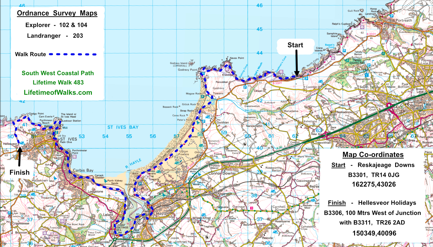 Start: Portreath - Reskajeage Downs, B3301, TR14 0JG Finish: St Ives, - Hellesveor Holidays, B3306, TR26 2AD Click here for: Next Walk on the SWCP and Previous LEJOG - Walk 484 Next Walk on the LEJOG and Previous SWCP - Walk 482 Return to 'Lifetime of Walks' Homepage Return to South West Coastal Path Homepage Return to Land End to John O'Groats Homepage | |||||||