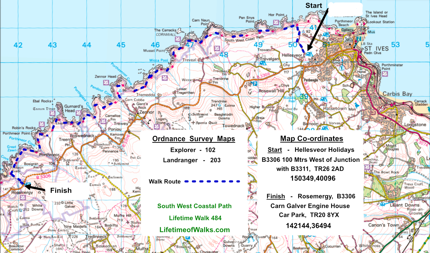 Start: St Ives, - Hellesveor Holidays, B3306, TR26 2AD Finish: Rosemary, - B3306, Carn Galver Engine House Car Park, TR20 8YX Click here for: Next Walk on the SWCP and Previous LEJOG - Walk 485 Next Walk on the LEJOG and Previous SWCP - Walk 483 Return to 'Lifetime of Walks' Homepage Return to South West Coastal Path Homepage Return to Land End to John O'Groats Homepage | |||||||