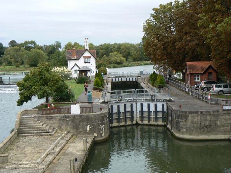 Parked in the Swan car park, Streatley and walked over Goring Birdge to north bank, passing Goring Lock and Weirs. Barges and pleasure boats moored south of bridge. Sally talked to several boat owners and spotted a heron fishing on the opposite bank. The path soon opens out to meadows before the great western railway bridge and detours from the river at Ferry Cottage, after the bridge near Gatehampton Manor. The path slowly climbs through Hartslock Wood and diverts around Combe Park away from the river. After the puff of the climb, we stopped for a while at the narrow path as Sally sampled the local blackberries. The way ahead dropped sharply for a short distance then continues at a height to a Tarmaged Lane leading to B471, Whitchurch on Thames. Care required down the narrow road past cottages of character to the toll bridge. Path detours briefly around the narrow section of the road, past the church to the grandeur building around the mill pond. Over the bridge to Pangbourne and a hunt for a tearoom. Hunt ended at the Elephant Hotel where we enjoyed a large cup of tea on a very lazy settee, back to the river at Pangbourne Meadow where large crowds had gathered to enjoy canoe racing. Onwards along the vast open and flat meadows to Purley on Thames passing Alpacas on the field on the opposite bank and numerous luxury pleasure boats. At Mapleourham Lock we stopped for a welcome ice cream as several steam boats passed through the lock. Strange to hear the familiar steam toot from a boat rather than a steam engine. Through the pleasant hill streets of Purley, past modern detached houses to the busy main road and back to Sally's car at the disused Rowbuck Public House. Soon found the local Toby Inn to round off another fantastic walk with Sally on the Thames Path.