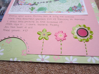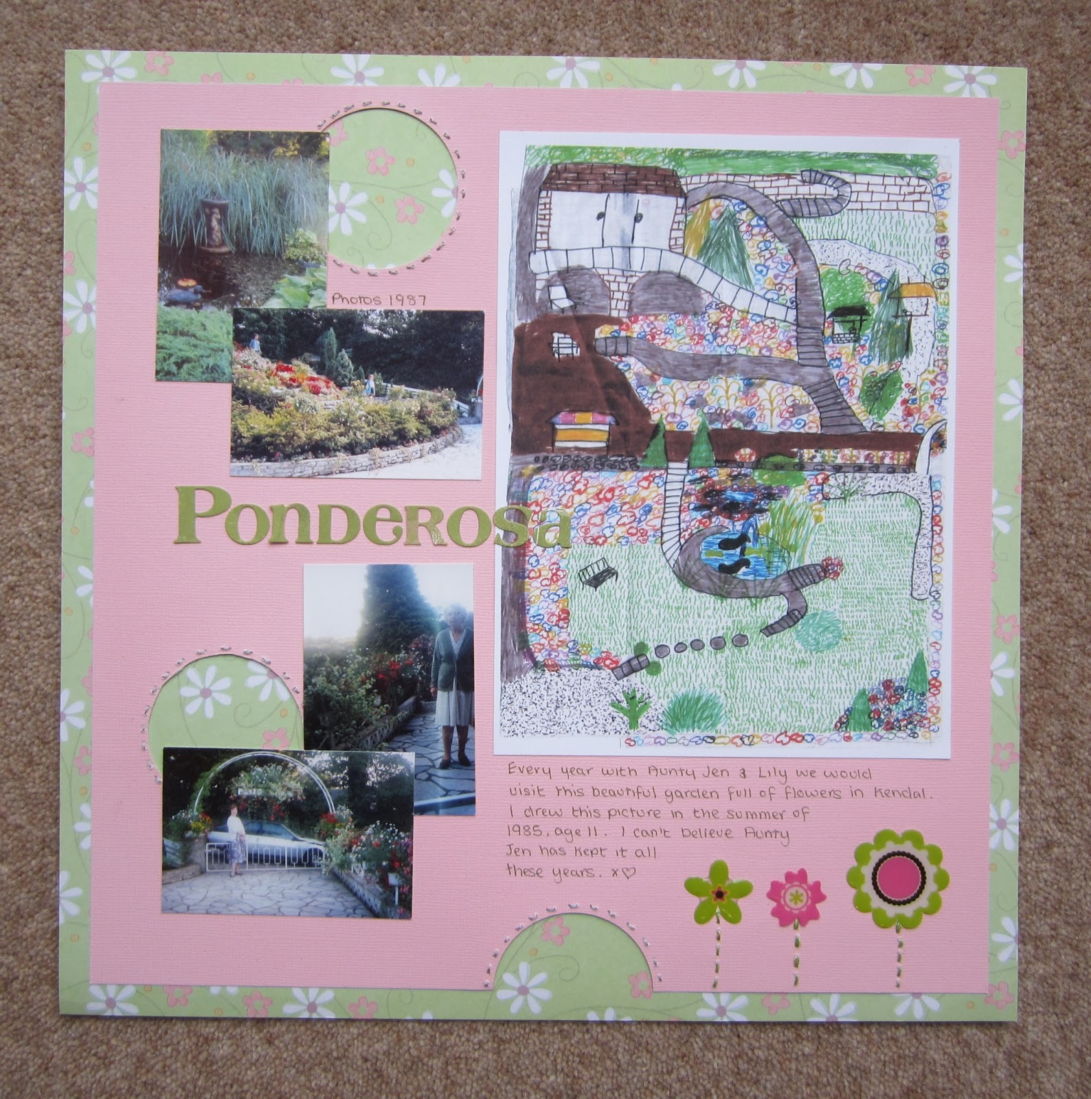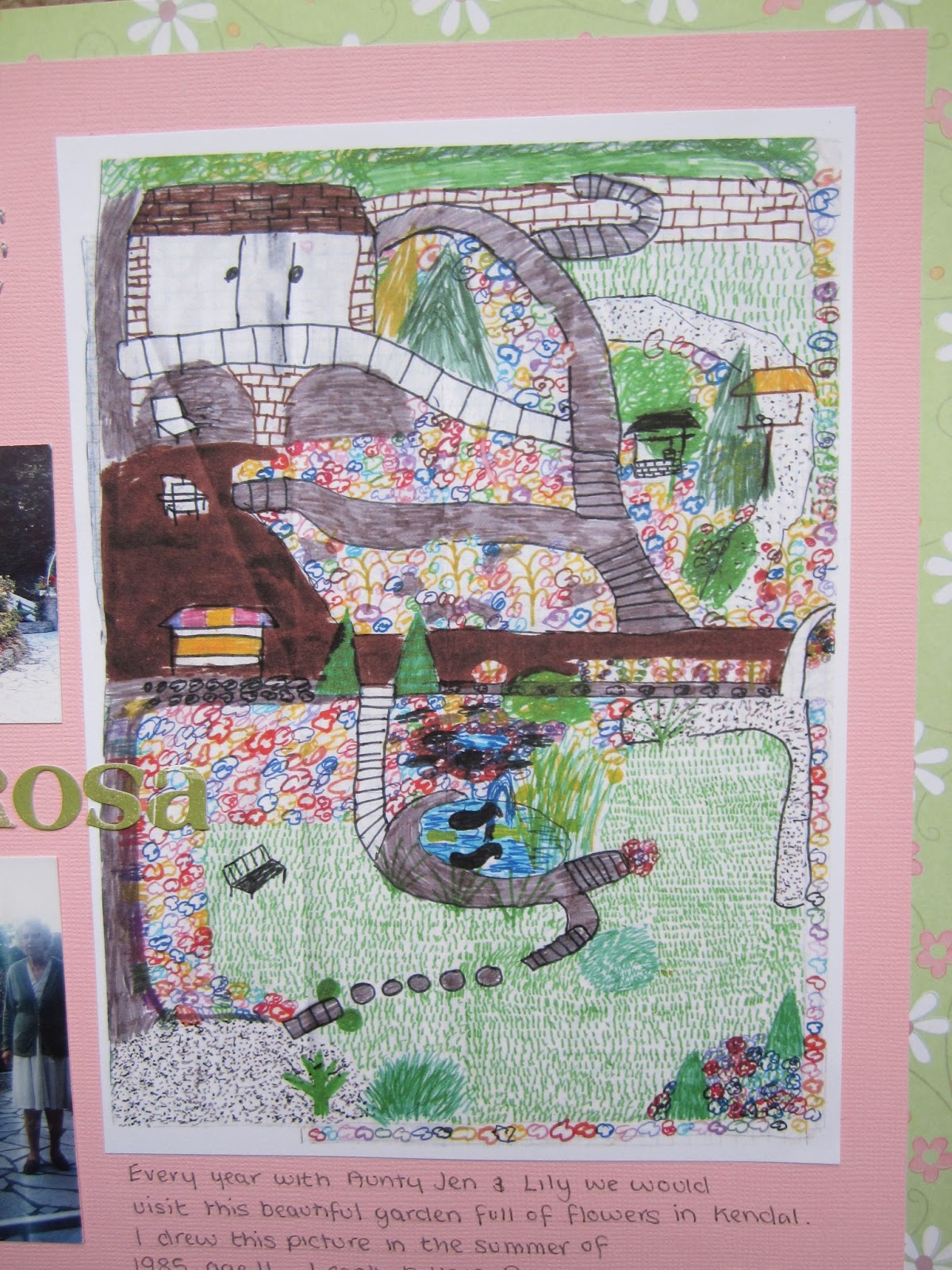 I managed to finish this page which brings back some lovely memories. Every year when I was a child me and my grandmother Lily would take a trip to visit my aunty and uncles house over the summer holidays. In 1985 after visiting the garden (I was 11) I went back to my Aunty’s house and drew the garden on some paper. Last year when going through some of her old photos she gave me the picture. Such lovely memories as the garden was soooo beautiful. The photos were taken in 1987 I think by my dad or Aunty and shows my little sister, cousin, aunty and grandmother lily in them