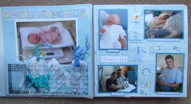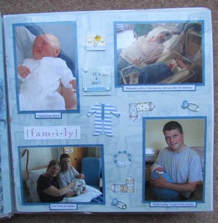 When my son was born in 2005 my older sister Jacqui bought back some scrapbook supplies from America, and well I was hooked!!! My first pages are very basic. But you know what …. they tell the story and I love them. Of cause they make me cringe, but I wouldn’t change them, we all have to start somewhere. My son looks so small and that was nearly 8 years ago now. I love the photo of Tom on the scales taken by my Husband.