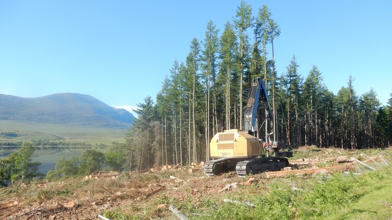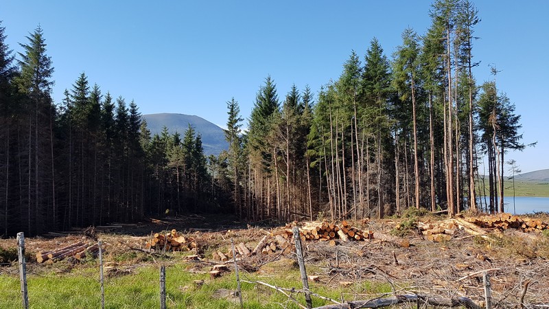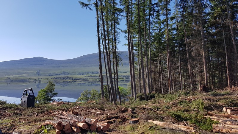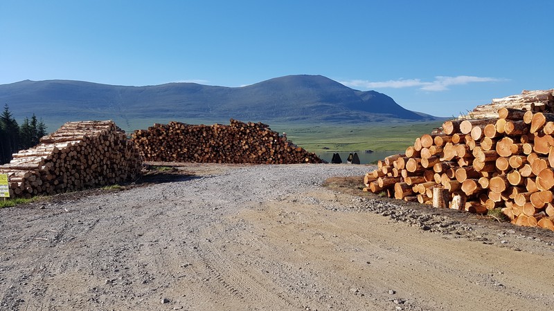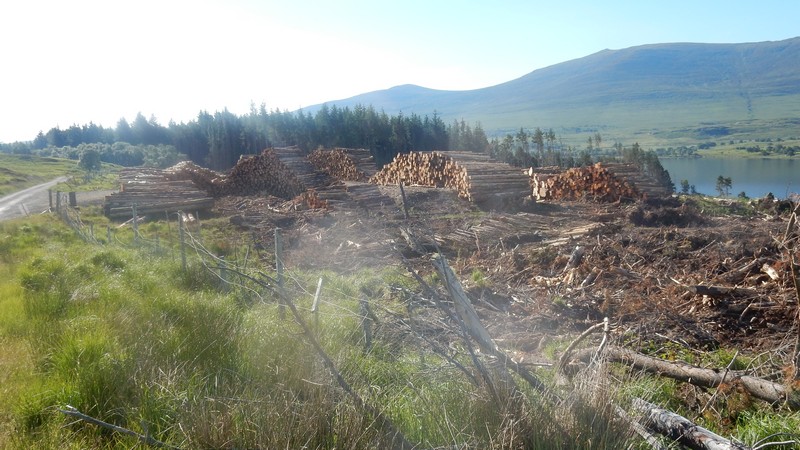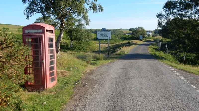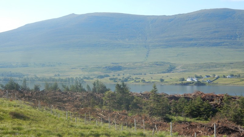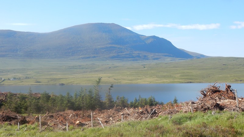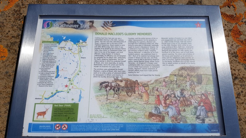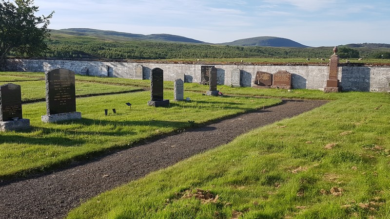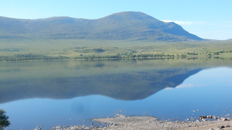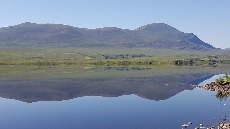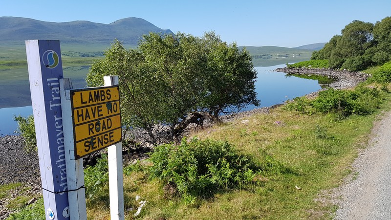I drove from Bettyhill along the A836 & B871 roads to the junction of B873 & B871, where I found a shady spot in the car park near Syre Village Church. This is a very sparsely populated part of the United Kingdom, so the chances of seeing a person or a vehicle are small. Especially as there is very little through traffic, just the odd holiday maker, like me. I waited for the bus to arrive, which it duly did. I know what you are thinking, 'how did you find a scheduled bus in the far north of Scotland'? It wasn't easy, but I will try to explain. When I did my research, on the web, while I was preparing for this walk, I looked for the best option for getting to and from the accommodation, to and from the start & end of the walk and my car. The options are, walking, cycling, thumbing a lift, bus, train or taxi. I discovered very occasional buses in the area. So, I discussed the problem with the bus operator and I was told it was possible but it would have to be early morning on a weekday. After careful consideration I concluded this was by far the best option. The mini bus arrived with just the driver, exactly on time. This was another surprise as there was no bus stop or bus shelter to be seen. We drove along the B873 towards Altnaharra, so I naturally started chatting to the driver. I soon learned that the bus was a school bus on its way to collect the children from the surrounding villages, spread far and wide. This explained why the bus was so early. I quizzed the driver about the possibility of another ride for the next section of my adventure, the next day, Thursday. However, he didn't go into Bettyhill but drove from his home at the bottom of the hill, straight towards Altnaharra. I thought about walking down the hill, but as I was in a cheeky mood I asked if he could collect me from the top of the hill outside the accommodation,. He said he would so we agreed a time at his convenience. When we arrived at Altnaharra, the driver asked if I wanted a ride round the villages to collect the children, because he would return to Altnaharra to take the children to Bettyhill. I had to decline because I knew the walk was a long walk with lots of unknowns. We agreed he would get the children to wave to me as they passed while I was walking along. The driver stopped the bus at the junction of A836 & B873, so I jumped out. This was the perfect spot, the exact location where I finished the previous day's walking. I looked round and took the customary photos and then started my walk and adventure to my car at Syre Village along Strath Naver valley. The B873 road gained height slowly giving me a much better vista to the south, looking towards Ben Klibreck, Loch Naver & the village of Altnaharra. Because there was a deep high pressure weather system over the region at the time, with very little cloud and wind, the view was spectacular. How lucky I was. As I got to the brow of the hill, I reached Grummore Little Wood and the logging which was well in progress as I passed. There were lots of neat piles of timber, all sorted to the appropriate trunk size and length, scattered around a temporary road off the B873 road. At the east end of the wood there was more activity, but this time the action could be clearly seen from the road. However, the action was only to the logging equipment, the driver repairing the jib head equipment ready for more production. So, unfortunately I couldn't see the logging process in action, up close. All I could do was continue walking with disappointment etched on my face and a frustrated walking action. As usual there were many reasons I could not foresee which would delay my walk, so time is always of the essence and a trade-off is always to be considered. The road at this point was close to the shore of Loch Naver, so Ben Klibreck Mountain was clearly visible from the single track road. As I glanced across the Loch the view was so incredible I had to stop in awe and take photos of the perfectly clear cloudless mountain and the millpond stillness of the water. The icing on the cake, as far as the view was concerned, was the reflection of the mountain in the Loch. It was a crisp mirrored reflection with the colours and the detail all perfectly formed with no distortion from the motion of the water. A bird in the water or a puff of wind would have disturbed the tranquility. I walked on and the quiet and stillness was abruptly shattered by a loud hoot of a horn. I turn to discover the school bus advancing towards me. I jumped off the road onto the verge and waved back to a bus of school children all waving vigorously at me. Unfortunately I didn't have time to raise my camera and take a photo because my arms were busy waving back to the children. But, the memory will stay with me forever. As I walked on, I soon came to a notice on the roadside next to a Strathnaver Trail post, which I thought was very clever. It read, 'Lambs have no road sense'. As the lambing season had passed many months previously, the sign didn't have the same meaning, but still applied to sheep. However, as the weather was hot, most of the sheep would search for higher ground and a chilly wind. The quietness of the Scottish countryside soon returned and after a while I came to the Altnaharra Caravan Club Site. There were a number of caravans and caravanettes scattered around the undulating area, with a small outcrop of rocks here and there. However this did not add to the noise level, perhaps it was a little too early for the campers. Onwards, forever onwards! Next I came to a Parking Area, and another Strathnaver Trail Post. An Information Board, explaining the history around the 'Land Clearance' and the demise of the old village of Grummore and the smaller village of Grumbeg, All that remains is the Old Grumbeg Cottage by the B873 road. Opposite the cottage the impressive wooded crag of Carn Ach' a' Chuil could be seen with its reflection clearly visible in Loch Naver After all the walking so far that day