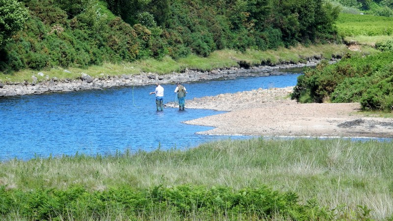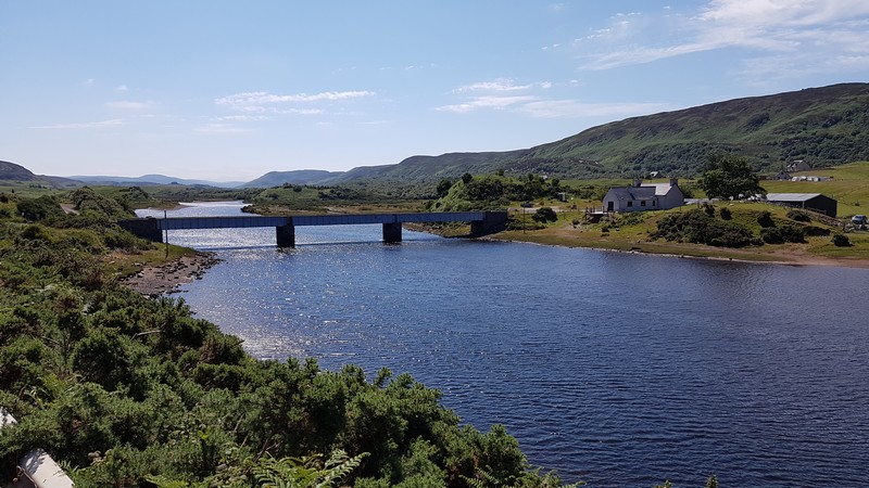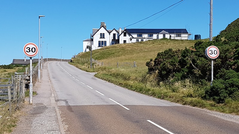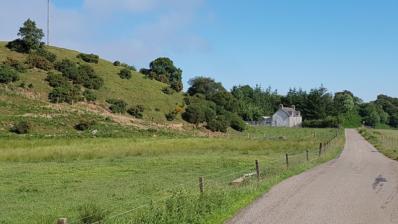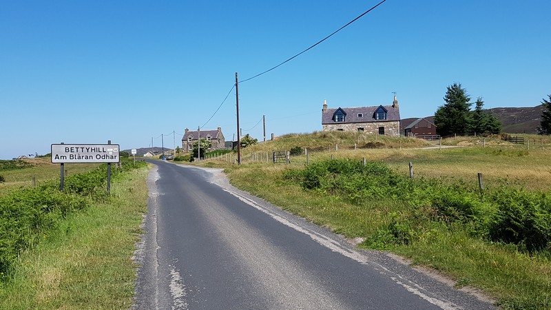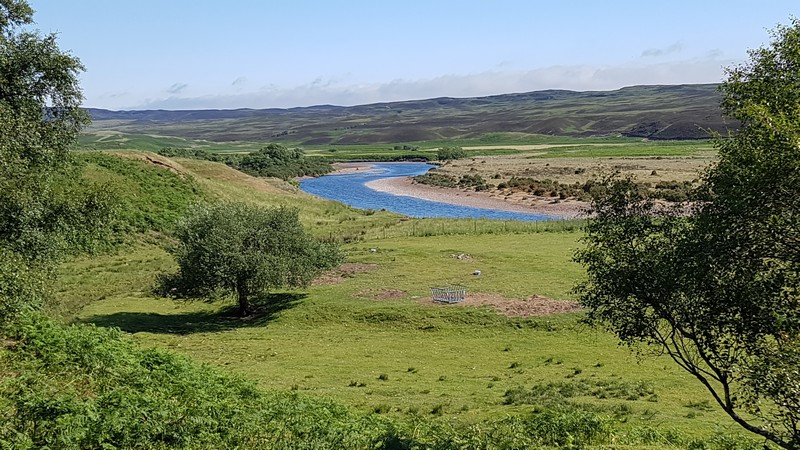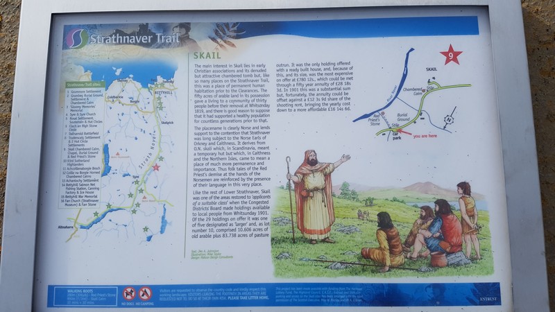 I waited at the agreed time for the school bus to collect me outside Bettyhill Hotel. I noticed a pedestrian bench opposite the hotel, so I sat down and waited patiently for the bus. Right on time the empty bus arrived, so I climbed on and sat down alongside the driver. We immediately started chatting, so I explained the previous day's walking along Strath Naver, Walk 1180. The driver was interested because the day before he had given me a bus ride to enable me to return to my car. We turned off the A836 road at the B871 junction, travelling south along the single track road with passing places. After a while, on a straight section of the road, I could see a car travelling towards us. This was obviously not unusual but, on this occasion the car and the bus did not slow down as the gap between them closed. I started to get worried, but as the vehicles passed each other, they both gave a small wiggle and carried on their journey at the same speed. Unbelievable, I was flabbergasted. I asked the driver about the situation, explaining my concerns whilst choosing my words with care, so he explained in detail. He said that he recognized the car therefore he knew that the car driver was experienced with the situation and would have perfected the maneuver over many times. Basically both vehicle drivers knew the road very well, including the passing places. Therefore each driver adjusted their vehicle speed, according to the road conditions and the distance to the passing place, so that the vehicles arrive at the passing place at the same time with the appropriate speed. Therefore, with a quick flick of the steering wheel at exactly the right moment, would enable the vehicles to pass at the best speed possible. We eventually reached the village of Syre, where I had finished walking the previous day. I asked the driver how much the fare was for the two bus journeys, and he said, “Nothing!”. Again I was flabbergasted, so I said, 'how come, I've had two bus journeys'. He explained that the boss (Mr Hird – 07782 110007) had told him not to charge for the two rides as I was the first person to use the bus service other than the school children. The primary purpose for the bus service was to take the children from the outlying villages, to and from their school in Bettyhill Village. I asked the driver to thank the boss for me. How wonderful was that? Alighting the bus I started walking north as happy as a sandman. The noise of the bus disappeared into the distance and was replaced with the tranquility of the countryside, miles from any town or industry. From the village Parish Church I walked the short distance to the road junction with the B871 at the telephone box and continued north, passing Syre Lodge and the village cottages to Langdale Burn. The burn was no more than a trickle, because it was summer and the North of Scotland was experiencing a dry spell of weather. However the burn would normally be a raging torrent, especially in the winter or during a wet spell. After passing the Hamlet of Langdale, I came to the Hamlet of Skail & the hand railed wooden raised path to the 'Chambered Cairn', by the Strathnaver Trail Post, on the right. I didn't appreciate the significance of the footpath until I reached the Information Board in the lay-by, near the Post Office, a little further along the lane. The Information Board was very interesting, a must read. Basically the Hamlet of Skail had existed for centuries from the small area of arable land, where a handful of dwellings stood until the 'Clearances' in 1819. The Chambered Cairn was associated with the hamlet & the Burial Ground for the community. Opposite the Car Park was another Strathnaver Trail Post, alongside a stile to a footpath to 'Red Priest's Stone'. This is another reminder of the Ancient Hamlet. At this point I noticed a sheep dog in the local farmer's general working vehicle. The farmer was giving instructions to another sheep dog, which was chasing about 'rounding up' the sheep in the field. It was a wonderful experience to see in the real world, instead of a competition on the television. I walked on until I reached the Strath Naver Public Hall & Memorial Stone. At this point there was yet another Strathnaver Trail Post alongside another must read Information Board and Memorial Stone. This is where the 93rd Sutherland Highlands Regiment was formed in 1800. After refreshments from my rucksack I continued north in the sunshine, towards Bettyhill, along the beautiful and picturesque Strath Naver. With ideal walking conditions and scenery there was a spring in my step. It was just me walking alongside nature. The single track lane twisted its way close to the River Naver with just an occasional cottage, vehicle or cyclist. Sometimes the lane was adjacent to the river and sometimes it was a field or two away. Also sometimes there was only a single bush or tree around and sometimes I walked alongside a wooded area, all adding to the sheer enjoyment of the walk. When I started to approach the road junction with the A836 I saw more and more evidence of the activities of the fishermen in the area. I even saw a gap in the roadside barrier for access to a ladder to enable the fishermen to reach the water level safely. Eventually I was delighted to see a couple of fishermen fly fishing in their wades actually in the river. I never saw them catch anything but they were obviously enjoying themselves. When I did reach the A836 main road, I could clearly see the cottages on the opposite side of the River Naver. I was obviously approaching civilization. As I started to walk along the main road I immediately came to a road sign which read '55 miles to John 'o Groats' (88 kilometres). This encouraged me to battle on to my goal. The main road was relatively busy with traffic, so I had to be much more careful walking alongside the cars and lorries (trucks). I obviously walked on the right hand side of the road, facing the traffic. The only exception 