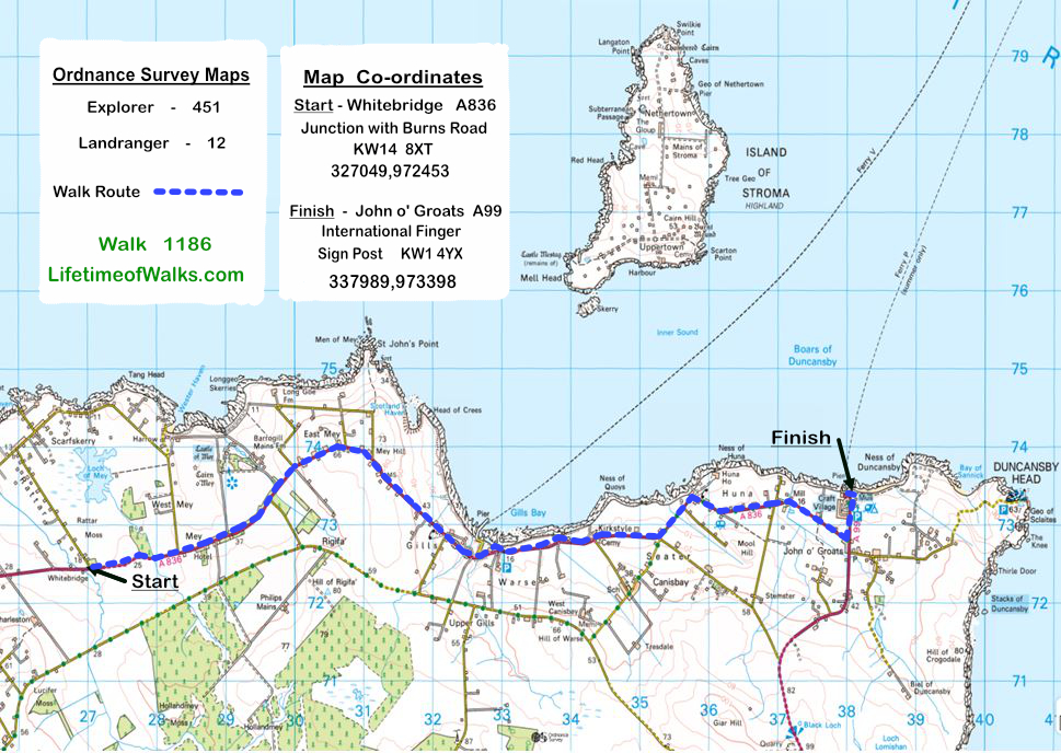 From the accommodation (Thurso House) I travelled in convoy to John o' Groats, with the Landlord & Landlady in their car, and me in my car. The Landlady had very kindly offered to drive me from John o' Groats to the start of the walk at Whitebridge, because it was a Sunday and no buses were running. I planned walking on the Sunday because it had the best weather window, with no rain forecast until after 2pm. At John o' Groats I transferred my walking equipment etc., from my car to their car, and they drove me to Whitebridge (near Mey Castle), the junction of the A836 and the minor road (Burn Road) towards Scarfskerry Village. I waved bye to the kindly couple as they drove off for their picnic by the sea. As it was so fiercely windy I immediately searched through my rucksack for my hat with a chinstrap because I had lost a few caps in the past due to the strong wind. I had planned to start walking at 9am rather than 10am as it was then. I was ready to leave the accommodation at 8am but had to wait until they were ready. I waited an hour, but as they were doing me a big favour, I just had to wait patiently, knowing the weather would deteriorate after 2pm. I started my last day's walking on the Land's End to John o' Groats Adventure from the low point near the Burn of Rattar, and slowly walked uphill, following the A836 towards East Mey. As I approached the Castle of Mey, which the Queen Mother had bought, in Mey Village, I noticed that all the Castle Road Signs were covered and the castle entrance had a sign 'Castle Closed'. Apparently the Duke and Duchess of Cornwall, or Prince Charles & Camilla, were staying at the castle for a week's holiday, so the castle was closed to the General Public. I took a photo of the driveway to the castle, with an arch of trees near the Castle Gates. I walked onwards in the sunshine and wind up the hill to East Mey, where the panoramic views of Dunnet Head Cliffs and the hazy Orkney Isles in the far distance were slowly unfolding. I kept looking over the dry stone wall towards the castle without any luck for a while, but eventually the top of the castle could be seen. I used my camera with a good telephoto lens to get a respectable shot of the castle with the Prince's Flag flying stiffly in the strong wind from the top of the tower. The scene was magnificent. I passed a small fenced off area around a very interesting old hand water pump on the right before Greag Namara Guest House and near the summit of the hill. At the crest of the hill the sight of Pentland Firth, Stroma Island and the Orkney Isles were magnificently laid out around me. But very strangely the Boars of Duncansby were very visible and intriguing, with a definite patch of the sea with very rough white water, or 'white horses'. I later learnt that this stretch of water is famous for its tidal race that flows like a river through the sea. Any boat without full power is soon swept away in the tremendous currents that flow particularly when there is also a storm in full force. I was obviously observing the boar at the turn of the tide because the sight was almost unique. The road slowly turned a right bend and and then an 'S' bend, before the long straight road downhill to the Pier Road in Gills Hamlet. The short road, as the name implies, was the access to the Pentland Vehicle Ferry at the pier in Gills Bay. As I walked onwards I passed some Shetland Ponies near Heather Bell, a car park or lay-by and some gorgeous new country houses. Here I saw more good views of the low lying Island of Stroma in the Pentland Firth and the 'White Horses' of the racing tide passing 'Skerry', the southern tip of Stroma. Further along the coast I came to Canisbay Church of Scotland & its cemetary. The church was very unusual as its tower had virtually no windows and a conventional sloping roof. As it was noon and the service was starting, I wondered if Charles and Camilla were attending. I walked slowly on and loitered by the cemetery but I didn't see the Royals. The cemetery was typical of Caithness with chess piece like memorials instead of 'head stones' at each grave. I could see lots of pawns, bishops and castles, with the odd king and queen, but no knight or horse. As I walked on past a couple of fields, would you believe I came across some horses. Apart from the couple of Shetland Ponies I saw earlier this was unusual because all the livestock I had seen were either sheep or cattle. The next point of interest was in the small hamlet of Huna. As the A836 main road turned to the right around a slow bend, a minor road continued straight to Huna House. At this road junction there were several cottages and surprisingly an old red telephone box near a red letter box. The door of the telephone box was wide open, inviting anyone to buy some produce from the shelves. I was not tempted but I'm sure many people would be. A couple of bends later I came across some old mill buildings, the rear of which made a good traditional picture of life as it was centuries ago, emphasized by the pack horse humpback bridge. From this point I looked across about half a dozen fields to the Hotel of John o' Groats, by the ferry terminal. I could see my final goal easily in the distance. and also at this point I was beginning to get emotional, the end of my epic walk. I continued walking down the straight road of the A836 to the A99, where the road signs read 'John o' Groats ¼ of a mile' and 'Wick 17 miles'. A sharp turn left onto the A99 and I was nearly there. The emotion was mounting as I passed my car in the car park and headed straight for the Directional Finger Post. I had finished!After all the planning, the logistics of getting around the countryside back to the car, hotel, etc. All that was left were the celebrations. The finger post pointed in the appropriate direction, as the crow flies, with Land's End 874 miles, New York 3230 miles, Edinburgh 273 miles etc. At this point I very strangely became very emotional. All my efforts