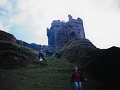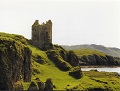 At '2' farmhouse up hill on right. At '3' path to castle through gate on left before house. At '5' follow good track to left of cottage, not behind. No tracks noticed to left, as per AA page. At '10' follow track on coastal side of cottage, uphill to hairpin bends. Continue through new gates to gate just before farm turning at '12'. Viewpoint at 'E' incorrect. The island of Mull cannot be seen from this point. The view described is probably from barnabuck at 'G'.