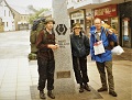 Day 1: 0-20 miles. Photo at start taken by support team of Derbyshire six. Approximately 15 started Way while we were preparing to start. Walked through park passing two golf courses which we thought was one massive course until we studied the map. Passed through lots of stiles where two levers are pulled apart. First break when we reached Old Blane Valley railway by trial jumps. Walked beside large water pipe buried in railway