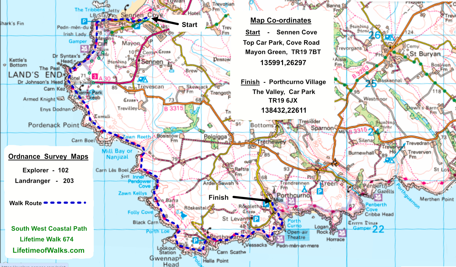 Start: at Sennan Cove, top car park, Cove Road, TR19 7BT Finish: at Land's End International Finger Post Hazards: Care required on the coastal path at all times. Many steep drops at the coves and the beaches. Click here for: Previous SWCP Walk & Next LEJOG - Walk 673 Next SWCP Walk - Walk 675 Return to 'Lifetime of Walks' Homepage | |||||||