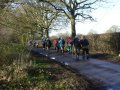 The NHS walkers congregated at the Three Horse Shoes Public House car park in Princethorpe Village on the Fosse Way. Started walk from car park, crossed main road to stile for footpath towards Priory Farm. The path emerged between houses on the B4453. Short walk besides stream on main road to footpath towards Wappenbury Village. Good views across to Princethorpe College, with its very distinctive red brick church tower. At first opportunity turned sharp right at footpaths intersection for track towards The Woodhouse Hotel. Strange to see the hotel from the opposite side, always viewed hotel previously from road. Extremely wet in places, almost flooding. Nearly missed stile but soon emerged at junction to Burnthurst Lane, by Princethorpe Great Wood. We all strolled down the lane, to stroke a horse by Nunswood Farm, before a sharp turn right down the lane passing Burnthurst Farm. Good views left towards Shrubs Wood, before the lane bears left and footpath continues ahead towards Bull & Butcher Farm. Stopped for refreshments on a log by a livestock control contraption. Soon continued ahead, over the main Coventry to Banbury Trunk Road, A423, passing the Bull & Butcher Farm on the right and an OS Column on the left. Thrrough the wood and onto Fineacre Lane, leading to Stretton-on-Dunsmore Village. We didn't enter the village but took the lane to the right, towards Glebe Spinney and Princethorpe, past a very old finger post. The lane soon ended and the way ahead changed to a footpath with kissing gates and stiles. Passed the usual horses but also some geese. We joked that the geese hadn't voted for Christmas. A short careful walk along the main road in Princethorpe back to the pub car park. A quick change of footwear and a group photograph before we all dived into the pub for a welcome Christmas Lunch. A good day was had by all, thanks to Jean.