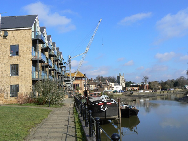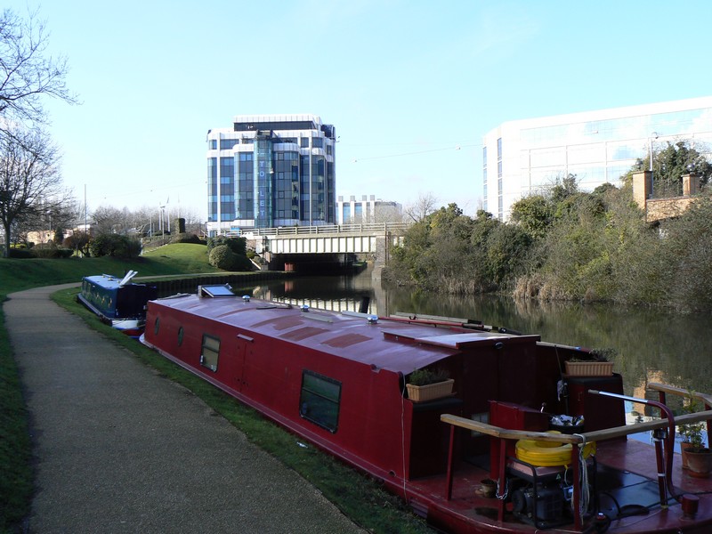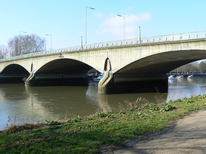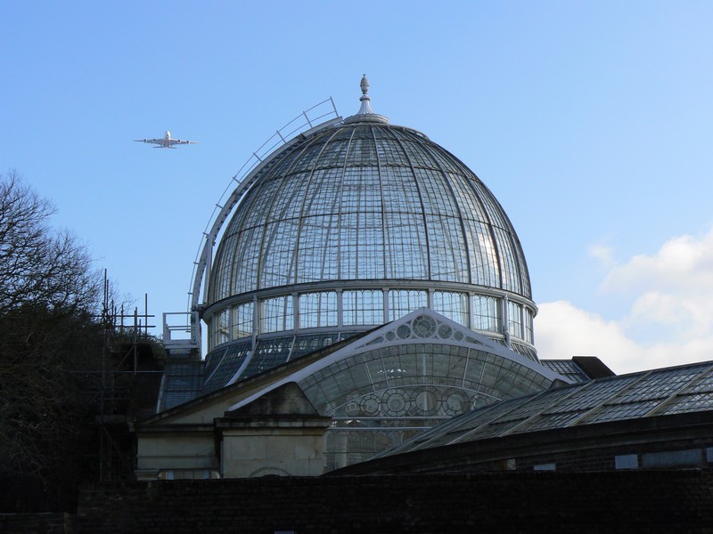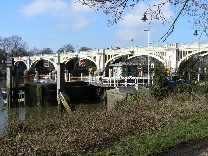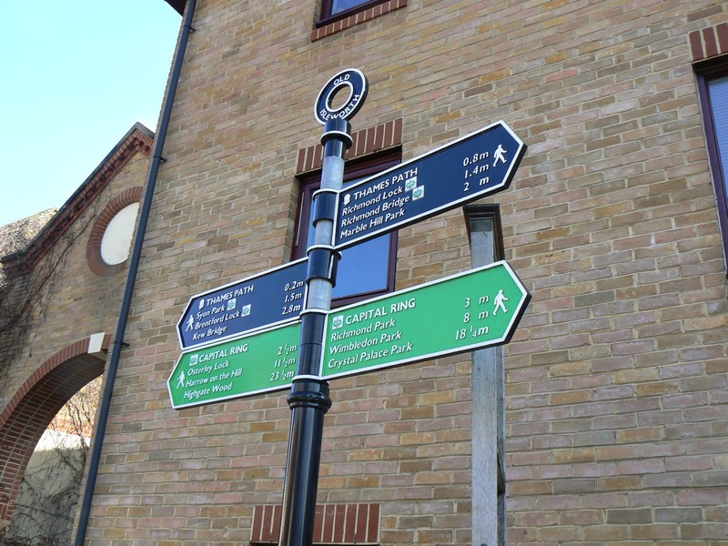 I arrived at Richmond off bus No. 56 to start the second leg of the Ring. Starting from the bus stop in George Street I walked down the quaint Brewers Lane to Richmond Green, with its ancient paths across the Green. I took a short cut through Friar Lane to Water Lane and the Thames river bank, past apartments with gardens so manicured they could easily pass for a town park. From the finger post on the river bank I walked towards Syon Park, 1¾ miles, passing the bare trees on the river islands full of cormorants and herons all preening themselves. I soon reached Twickenham railway and road bridges, with the unknown and strange fenced circular building hiding between them. After the bridges my attention immediately turned to the 'Old Deer Park' and Richmond Lock. Two stainless steel park information pillars and an obelisk on the right are inscribed with a map and on the left the impressively engineering lock. At first I thought I would have to make a large detour because the river crossing was closed, but close inspection revealed another set of 'open' steps on the north side of the lock. I crossed the lock to the Thames north/west bank and continued north, passing the end/start of the river crane walk and several rowing '8' boats on the river around Isleworth Ait. Watch carefully for the 'Ring' signs as the 'Loop' meanders around the wharfs and the Duke of Northumberland's river, of Old Isleworth to 'The London Apprentice', a famous and old public house dating from Tudor times. Here the walk leaves the river and heads to the Grand Union Canal as the many planes pass directly overhead on their flight path to Heathrow, as they land from the east. I passed through the entrance gates of Syon Park (closed at dusk) to the impressive Syon House with its even more impressive Great Conservatory. Nature called in the garden centre (cleaned it up honestly), then on to the Grand Union Canal at Brentford Lock, an area recently modernised.
