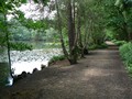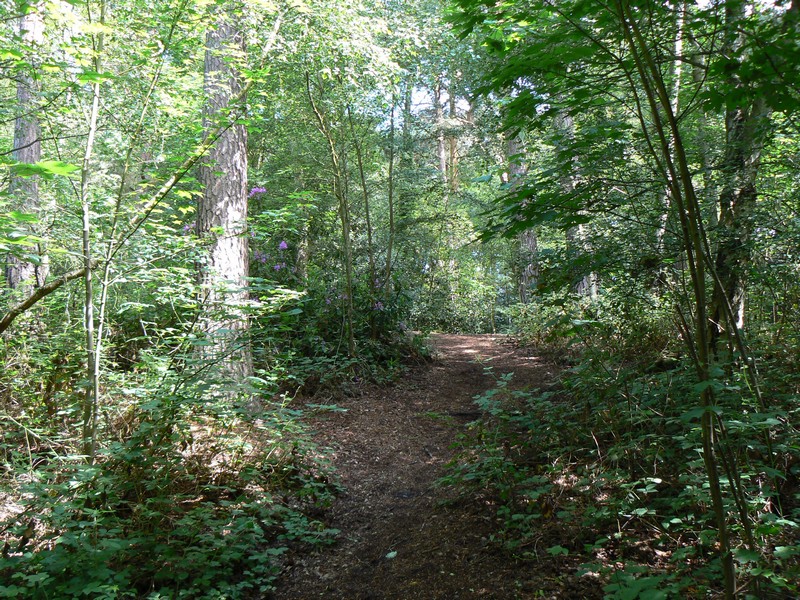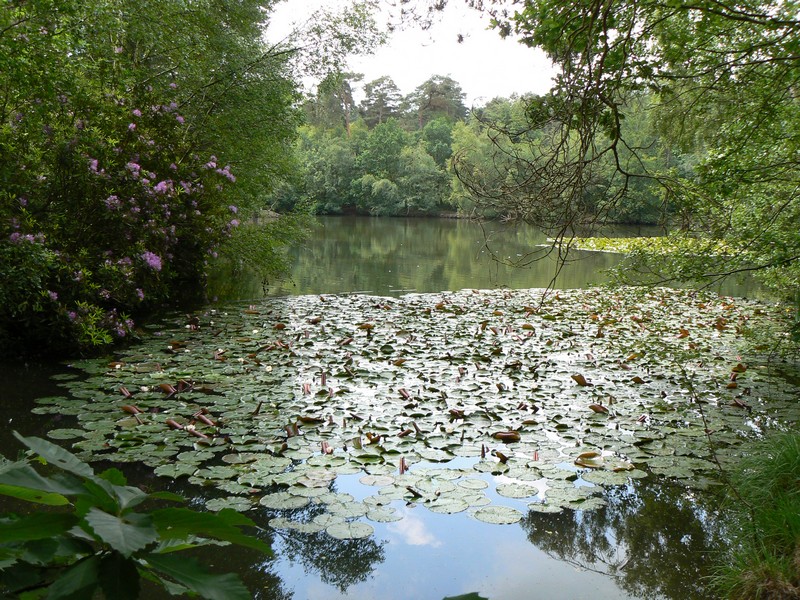 I parked in Wellesley Drive near Crowthorne railway station and walked over the railway bridge, past shops to the entrance of Wellington College along B3348. I took care along the drive as there was no footpath, using the grass where possible. As it was private land, I didn't trespass from the drive. I returned to Crowthorne station and followed the public footpath between new blocks of apartments to the east side of the railway line and alongside the college private estate past Pollock Bridge to the memorial at Lime Grove. Keeping alert I took the path across the railway tracks from the lane, into Ambarrow Hill National Trust wood to road A321. More care is required at the busy road because of the lack of a footpath. From the main road I followed a high wooden fence to the lane by Ambarrow Farm. I took the broad track from the lane at an iron gate on the right. What would you have given as a kid to own the playhouse of Ambarrow Lodge on the right, just inside the iron gate? I carefully negotiated the deep rutted muddy path before Boot End. There were rhododendron bushes along the track before Wellingtonia Avenue. A detour is recommended to Finchampstead Ridges for good views to the south-west. I returned to Wellingtonia Avenue and entered Simons Wood. There were more rhododendron bushes but the flowers were slightly past their best. It was a steep descent in places to Heath Pond and the Devil's Highway. There were good views in the sunshine of lilies on the pond with a small island in the background. I took the right fork on the wide track from Devil's Highway to the island at the end of Wellingtonia Avenue on A3421 road. I returned to the car with the sun still shining. I remembered Wellington College from the first walk, but nothing else.